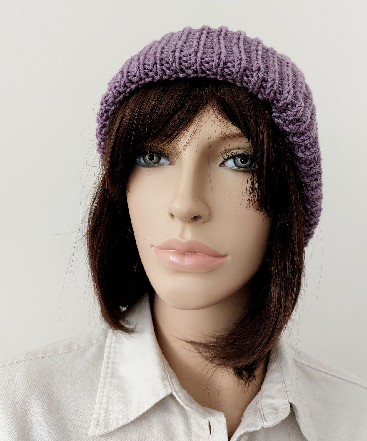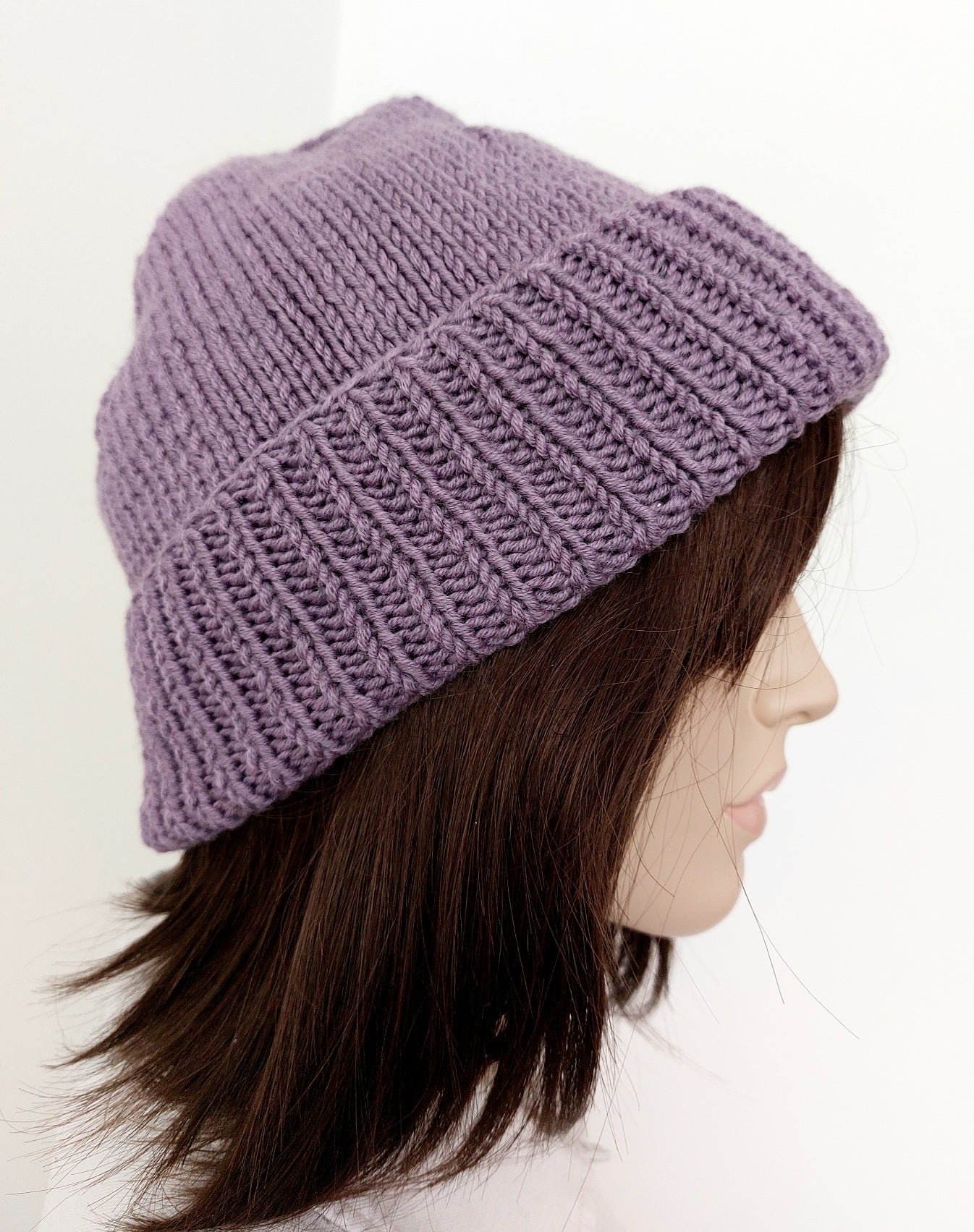 Na jehlicích ručně upletená čepice klasického střihu, hladká, zdobená vypleteným vzorem.