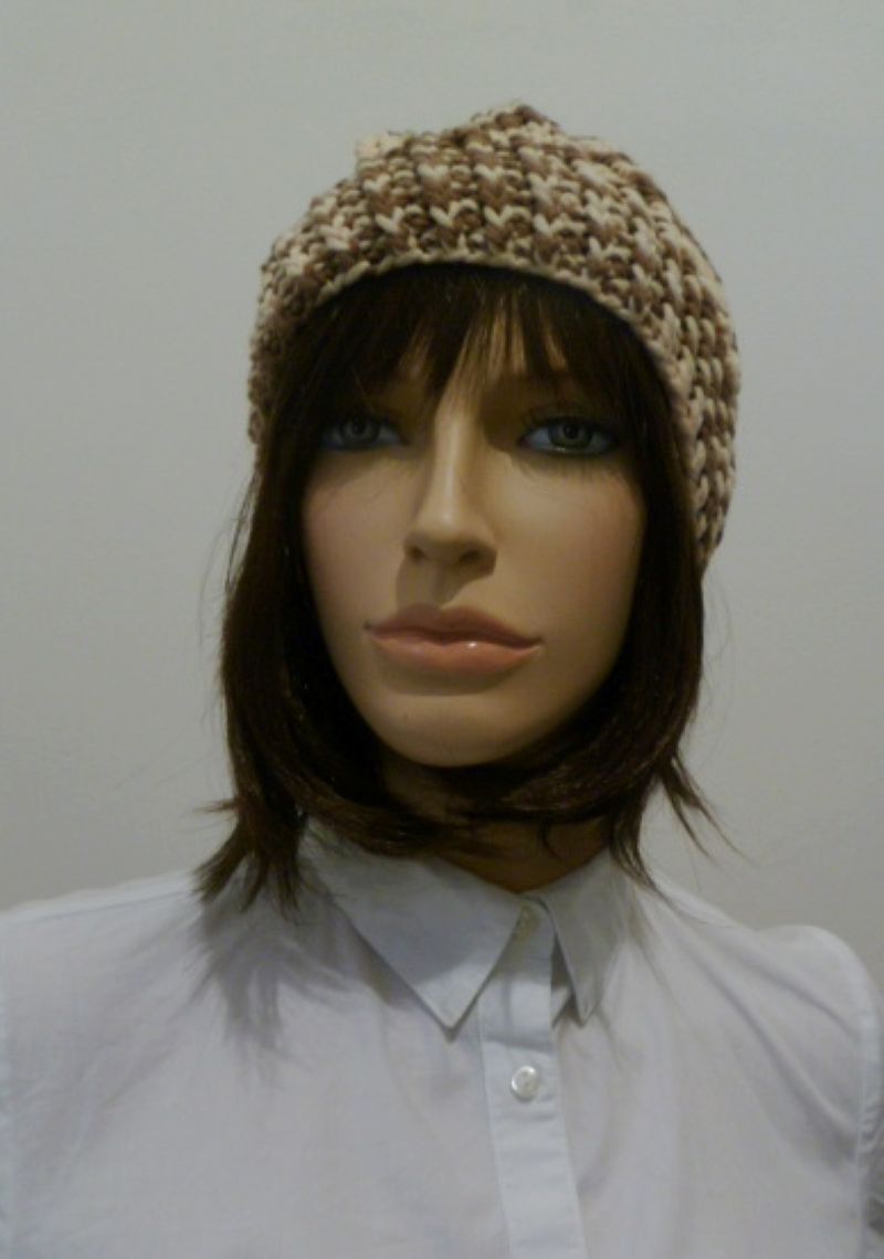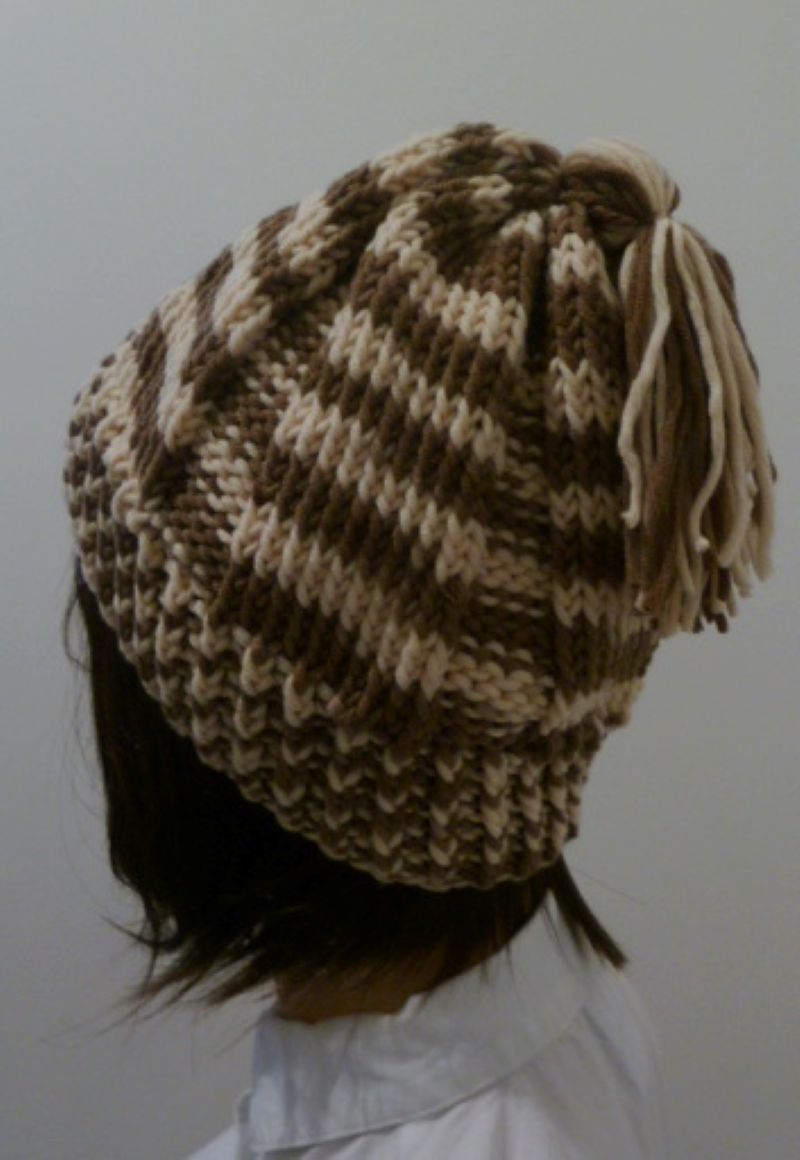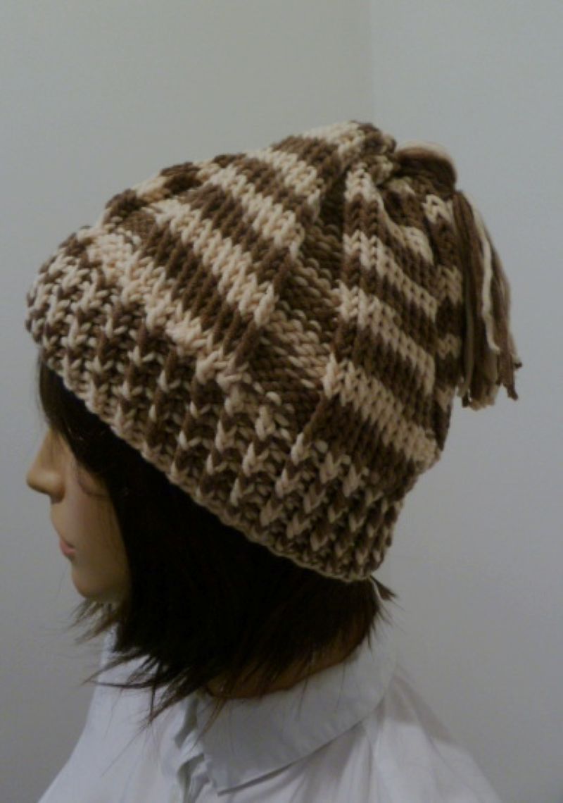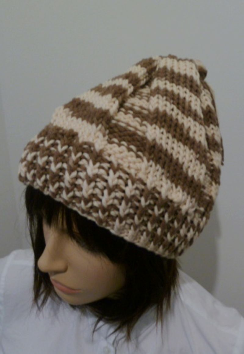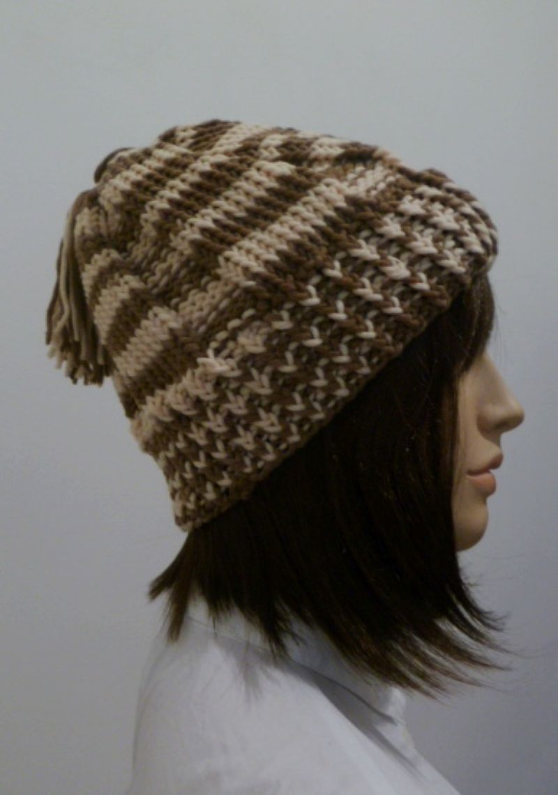 Ručně pletená, dvoubarevná čepice s vodorovnými pruhy a vyplétanými svislými širokými pruhy.