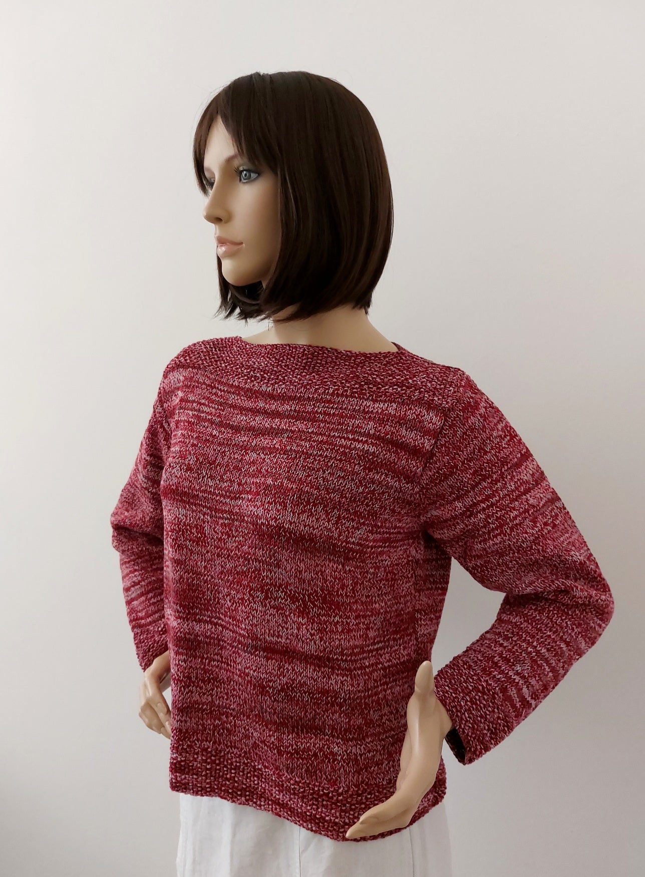 Ručně pletený svetřík hladký s ozdobnými lemy, výstřih rovný - nošením se vytvoří lodičkový tvar, dlouhé rukávy, bez zapínání - obléká se přes hlavu, méně pružný