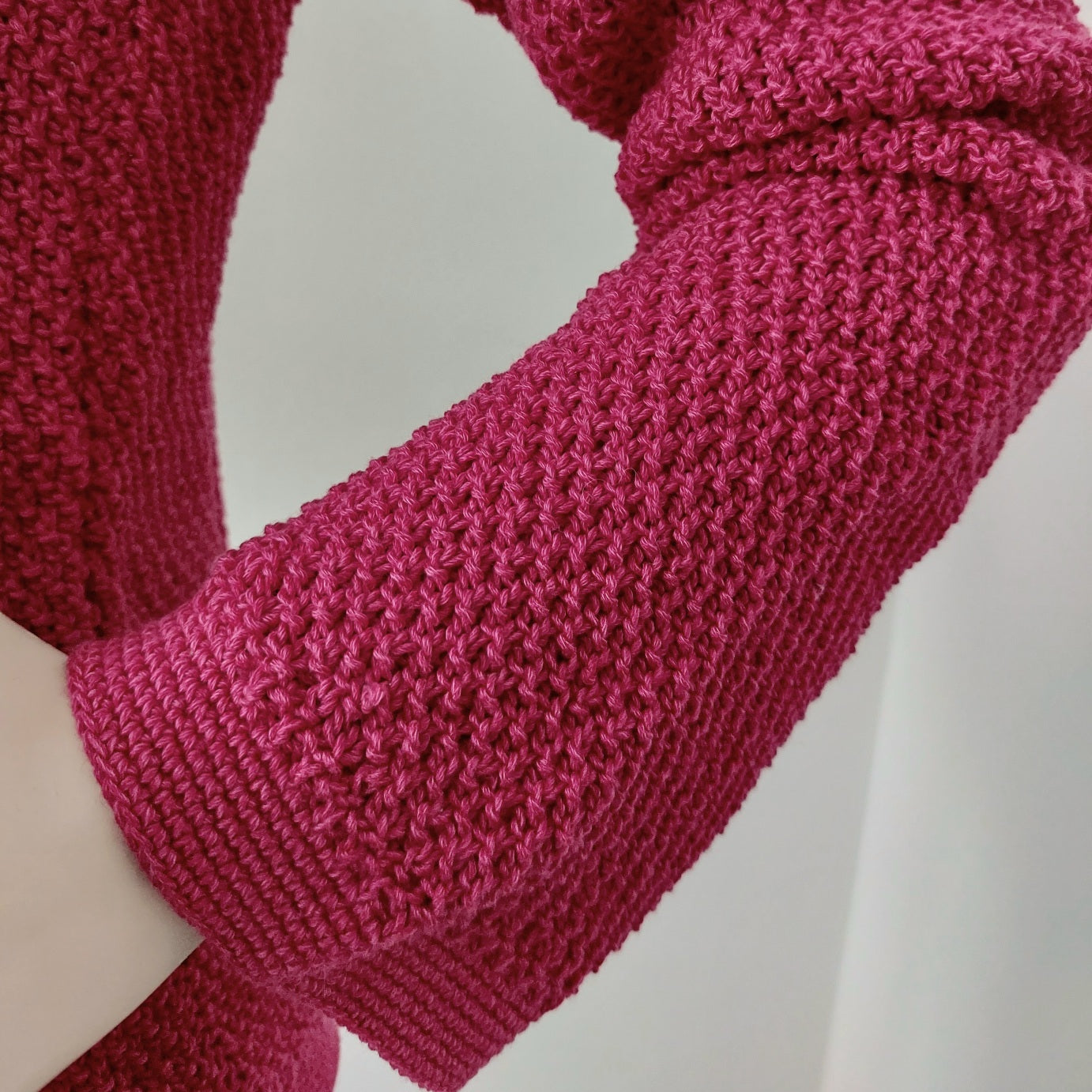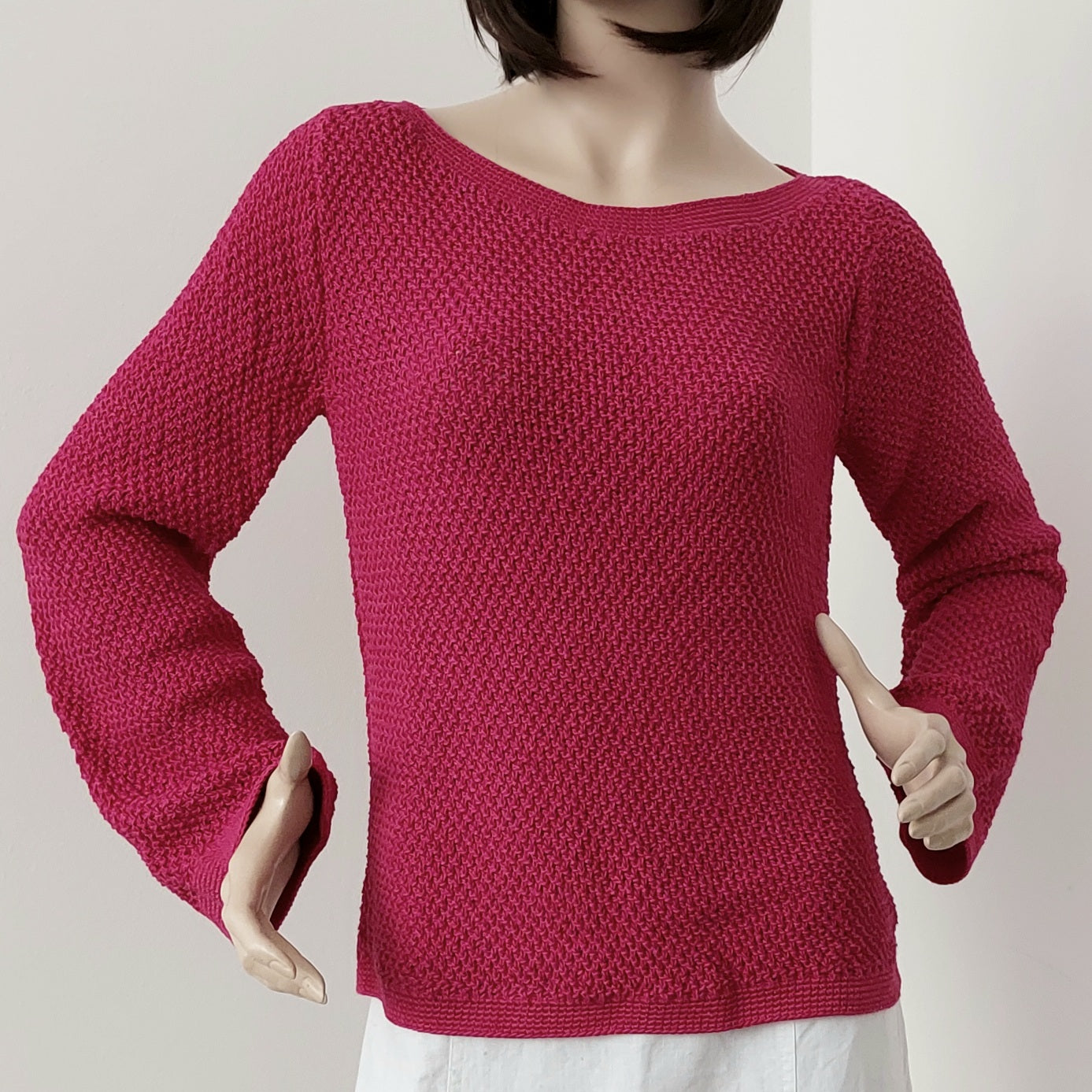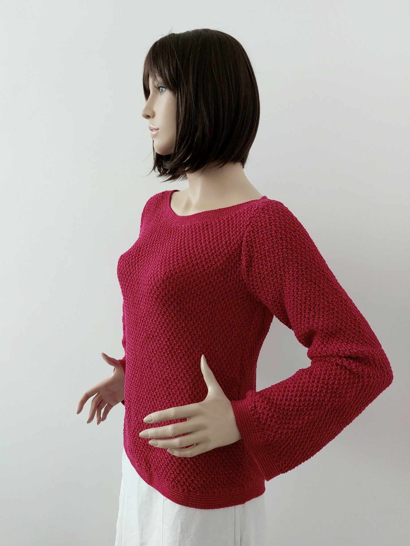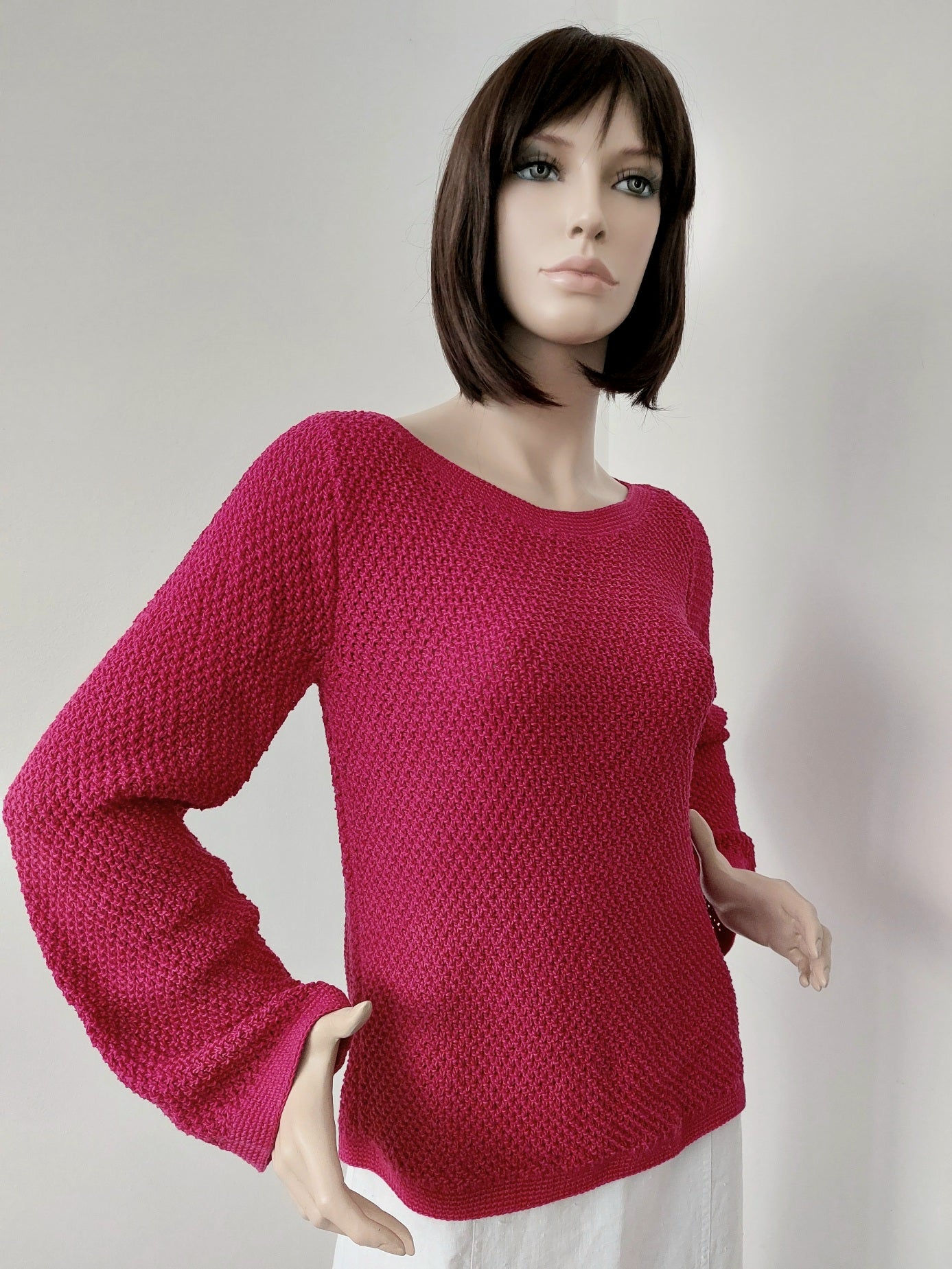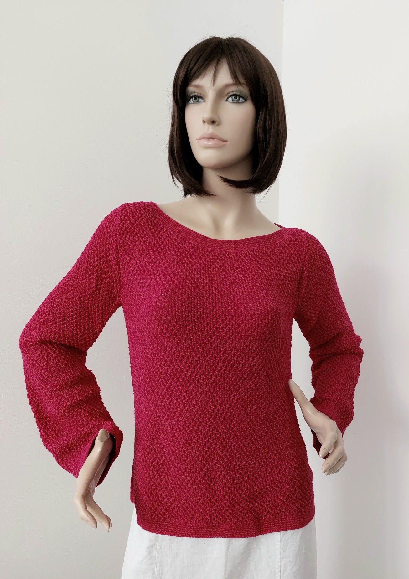 Ručně pletený svetřík s hladkým lemováním a vzorem šupina, lodičkový výstřih, dlouhé rovné rukávy, bez zapínání - obléká se přes hlavu, splývavý - ležérní styl.