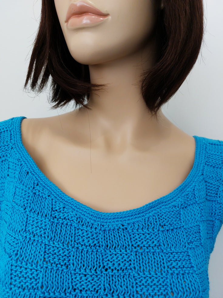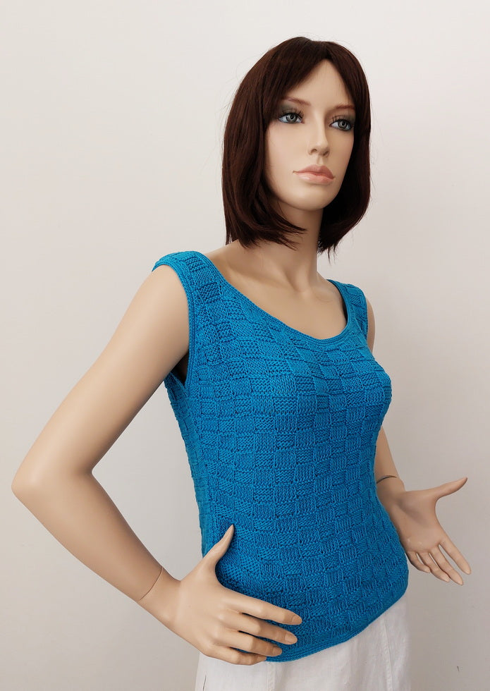 Ručně pletený top bez rukávů s hladkým lemováním a šachovnicovým vzorem, délka na boky, kulatý výstřih, bez zapínání - obléká se přes hlavu, splývavý - ležérní styl.